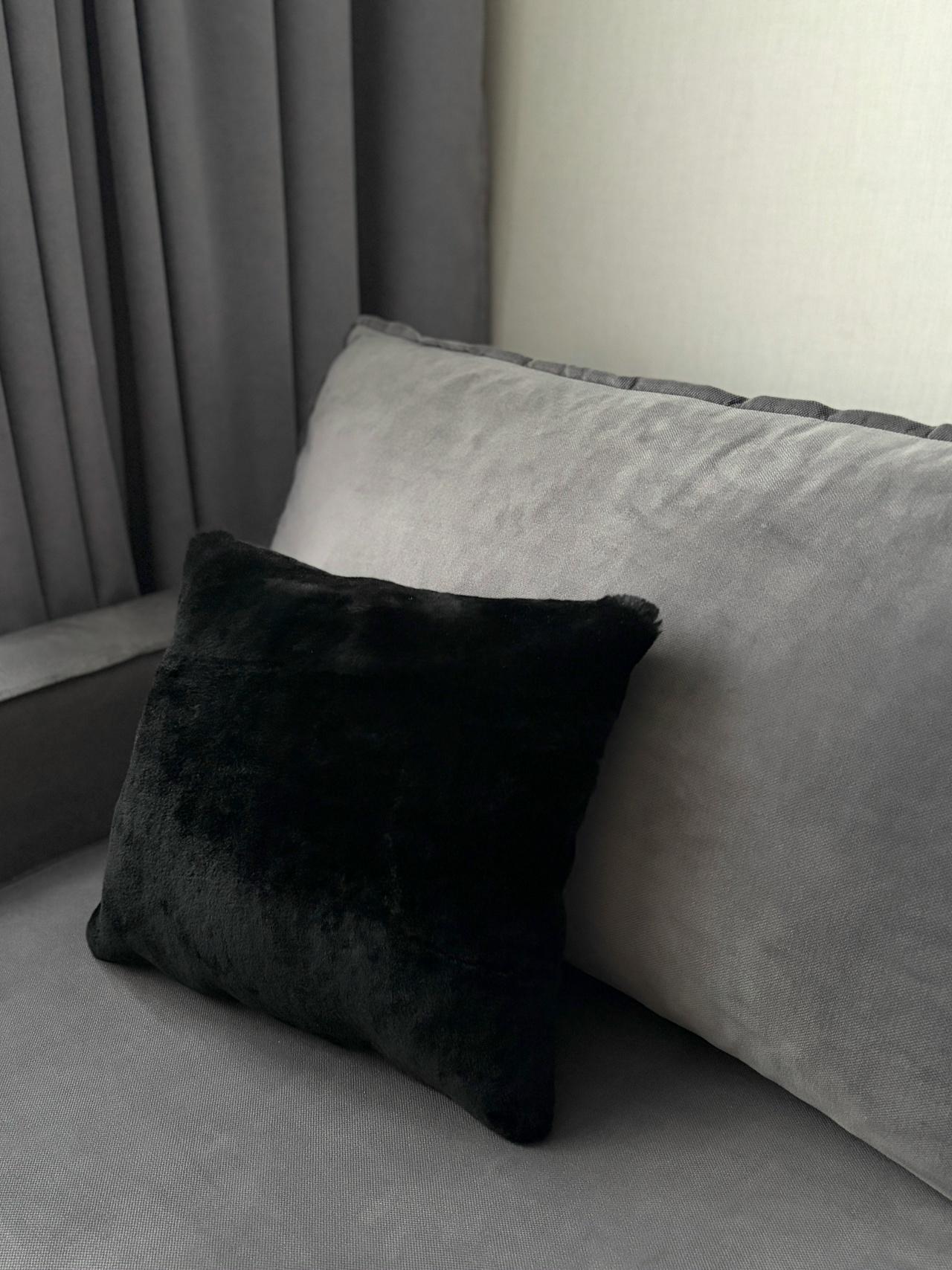 Максимум тактильного удовольствия Снаружи: черная натуральная овчина; бархатная на ощупь; без лишних деталей Внутри: хлопковая подушка с синтепухом Одинаково хорошо будет смотреться на диване, кресле или кровати — и в минимализме, и в более смелом интерьере.