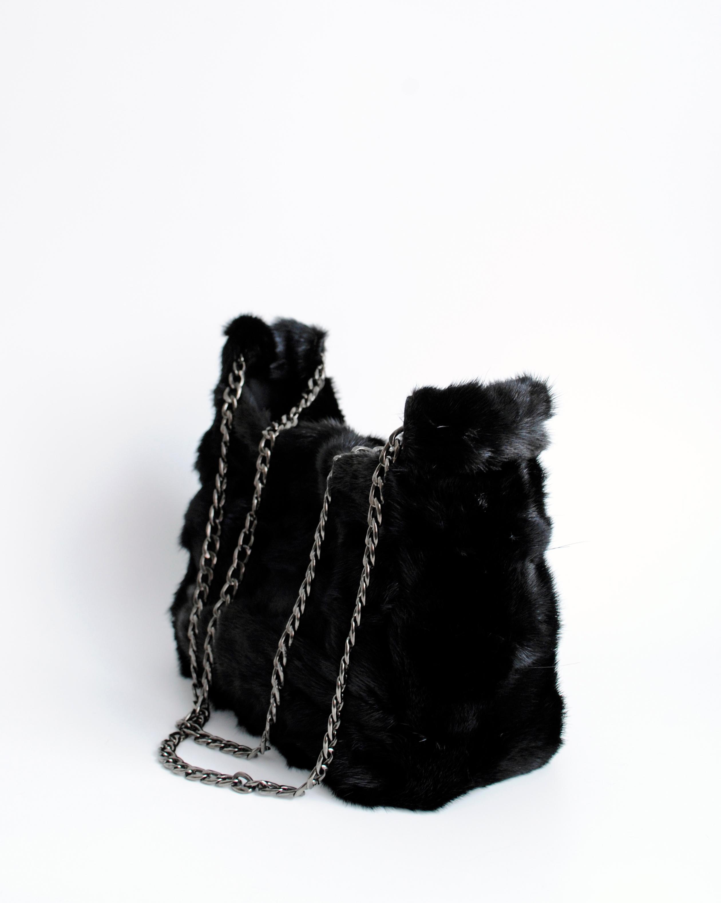Сумка кросс-боди из кускового меха черной норки. Лаконичная форма в сочетании с винтажным 100% денимом. Одно отделение на магнитной застежке.